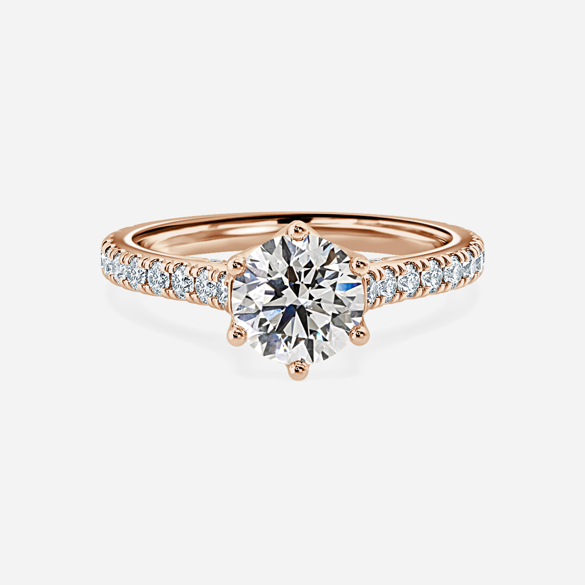 The six-prong diamond band rose gold engagement ring with a diamond set bridge is a dazzling and sophisticated option for those looking for a classic and unique design. Handcrafted in Hatton Garden, London Centre Diamond Not Included Setting Only