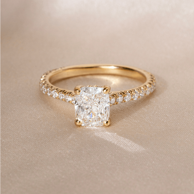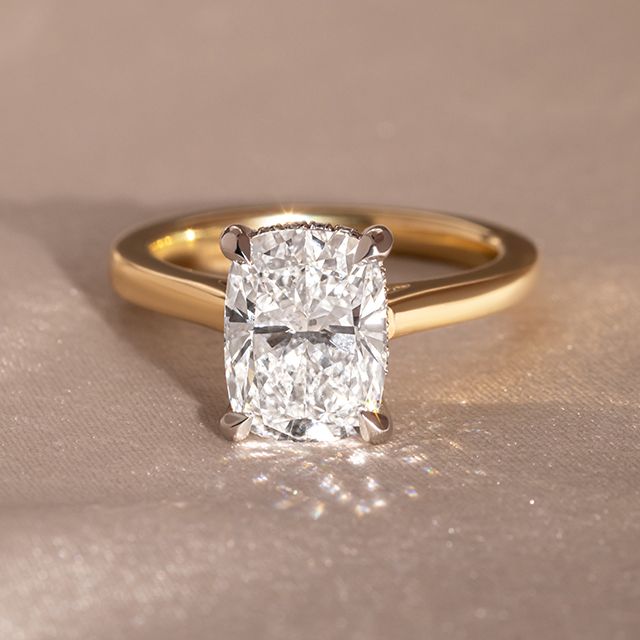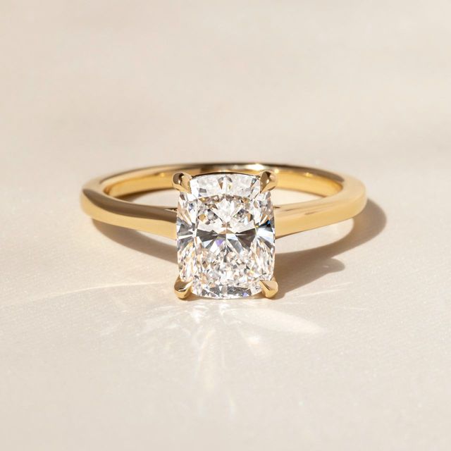 A 4ct elongated cushion cut diamond ring looks longer and more flattering compared to a regular cushion shape. An elongated cushion ring stretches the finger visually, while traditional cushions appear more square. Both offer soft edges, but the elongated style feels lighter and more open.