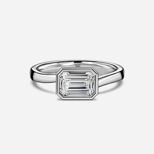A bezel set emerald cut diamond engagement ring, rectangular diamond in metal so that the edges and corners are protected from wear and tear. This design has a crisp and fresh look. Even a bezel set emerald cut diamond ring lowers the chance of chips and is great for everyday wear while showcasing the long lines of an emerald cut.