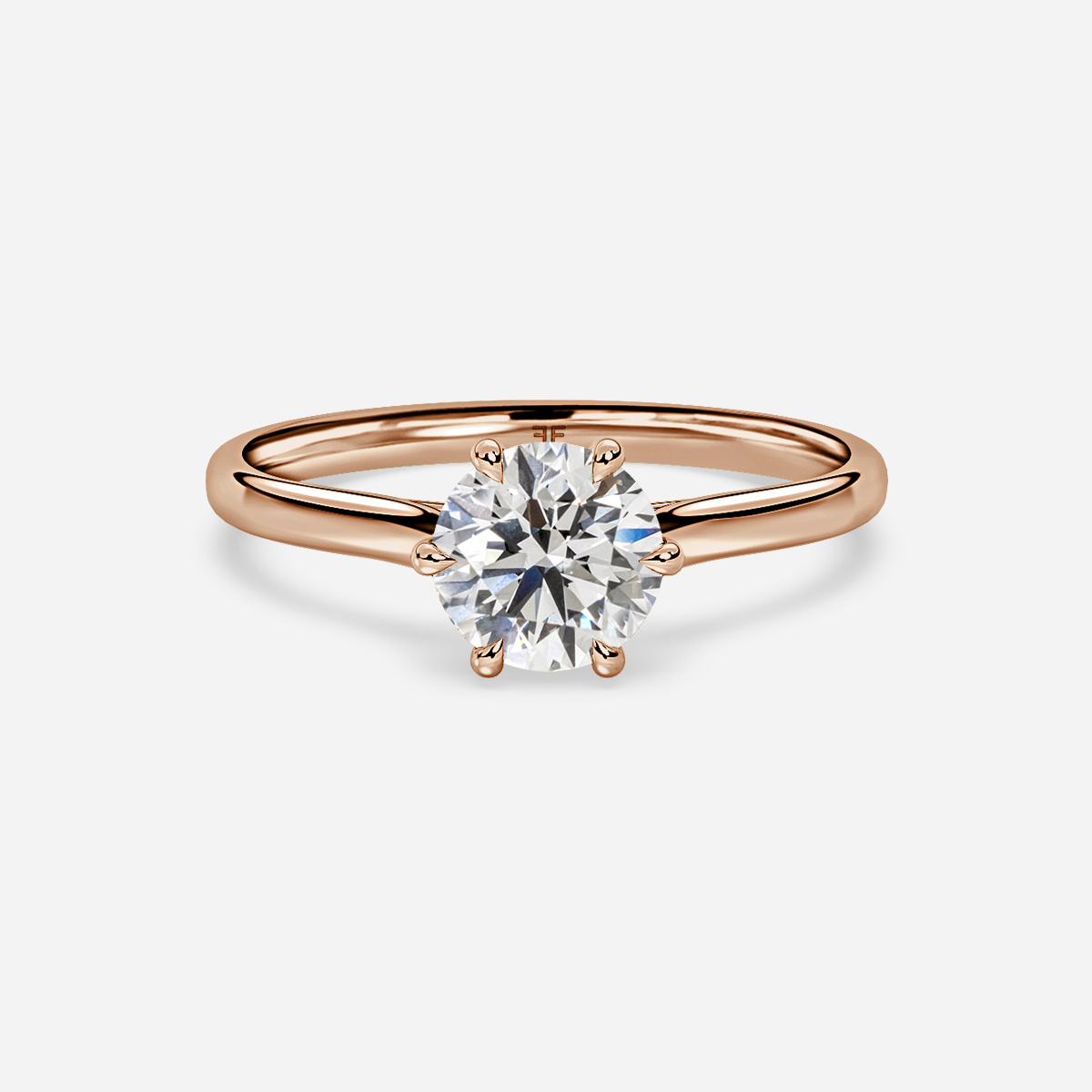 Classic and refined, this exquisite rose gold solitaire engagement ring with tapering band features a round cut diamond that sits within a six prong setting. Handcrafted in Hatton Gardens, London. Centre Diamond Not Included Setting only