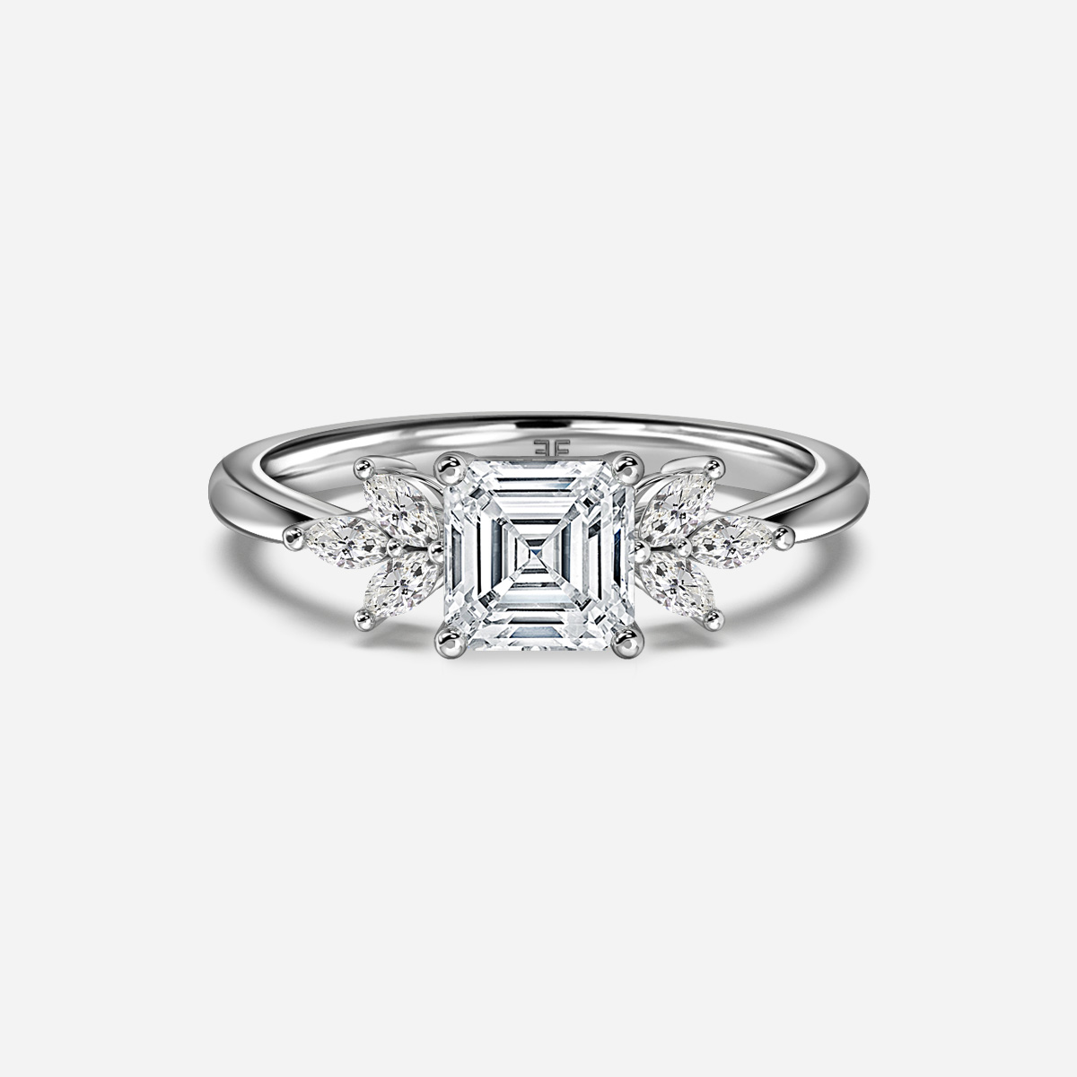 This white gold trilogy engagement ring features a central gemstone surrounded by a cluster of three marquise-shaped diamonds on each side for a stunning and unique look. Handcrafted in Hatton Garden, London Centre Diamond Not Included Setting Only