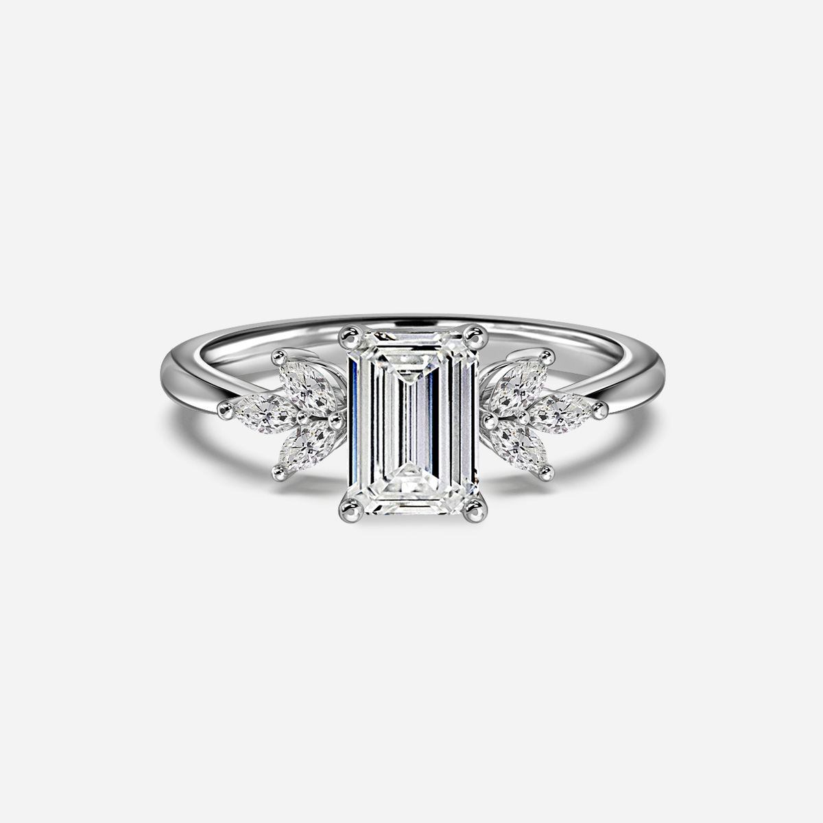 This white gold trilogy engagement ring features a central gemstone surrounded by a cluster of three marquise-shaped diamonds on each side for a stunning and unique look. Handcrafted in Hatton Garden, London Centre Diamond Not Included Setting Only