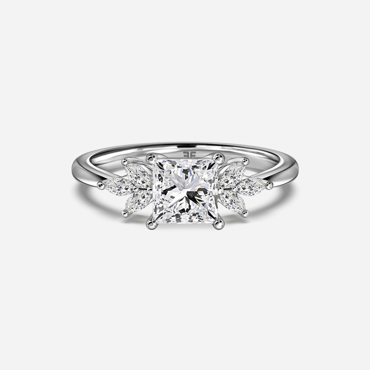 This white gold trilogy engagement ring features a central gemstone surrounded by a cluster of three marquise-shaped diamonds on each side for a stunning and unique look. Handcrafted in Hatton Garden, London Centre Diamond Not Included Setting Only