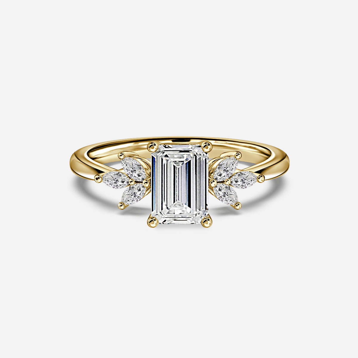 This yellow gold trilogy engagement ring features a central gemstone surrounded by a cluster of three marquise-shaped diamonds on each side for a stunning and unique look. Handcrafted in Hatton Garden, London Centre Diamond Not Included Setting Only