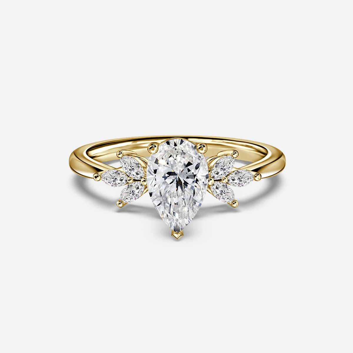 This yellow gold trilogy engagement ring features a central gemstone surrounded by a cluster of three marquise-shaped diamonds on each side for a stunning and unique look. Handcrafted in Hatton Garden, London Centre Diamond Not Included Setting Only