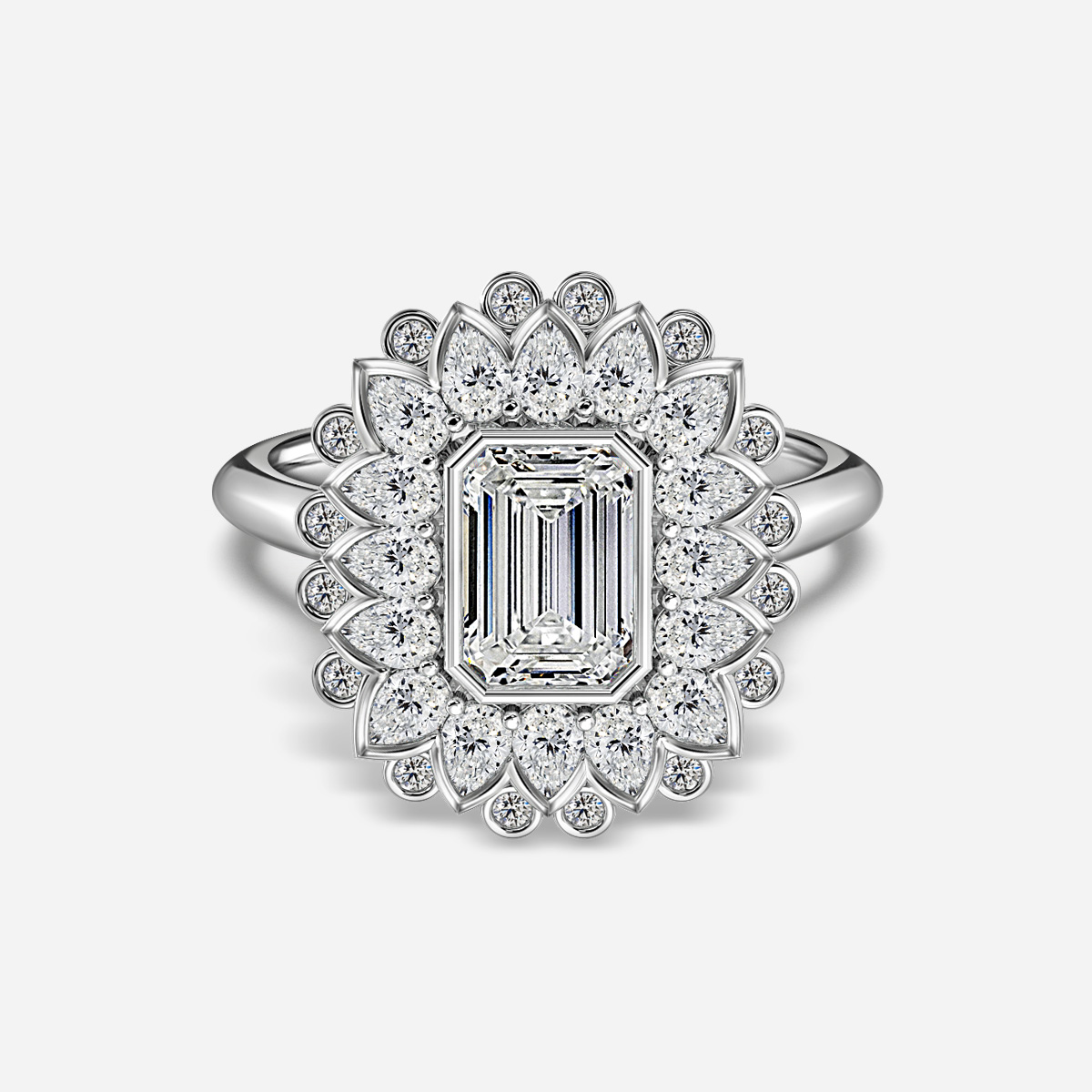 The Aelios Platinum Cluster Engagement Ring showcases a brilliant center diamond surrounded by a halo of pear-shaped diamonds, with additional small round diamonds placed beyond the pear shapes. This luxurious platinum setting creates a layered, radiant design, enhancing the ring’s elegance and extending its sparkling beauty. Handcrafted in Hatton Gardens, London. Centre Diamond Not Included Setting only