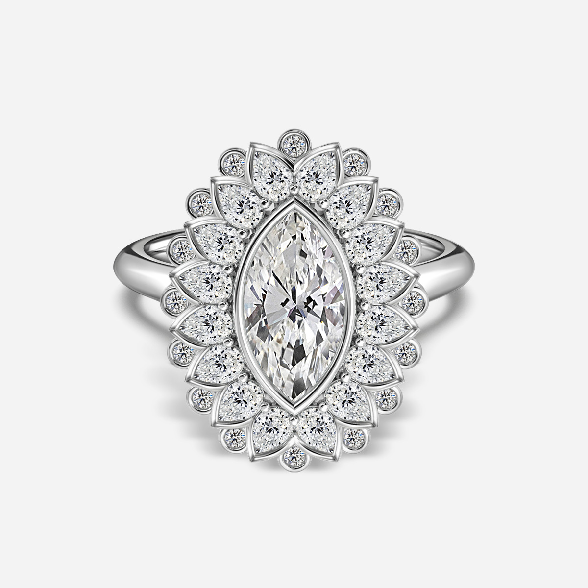 The Aelios Platinum Cluster Engagement Ring showcases a brilliant center diamond surrounded by a halo of pear-shaped diamonds, with additional small round diamonds placed beyond the pear shapes. This luxurious platinum setting creates a layered, radiant design, enhancing the ring’s elegance and extending its sparkling beauty. Handcrafted in Hatton Gardens, London. Centre Diamond Not Included Setting only