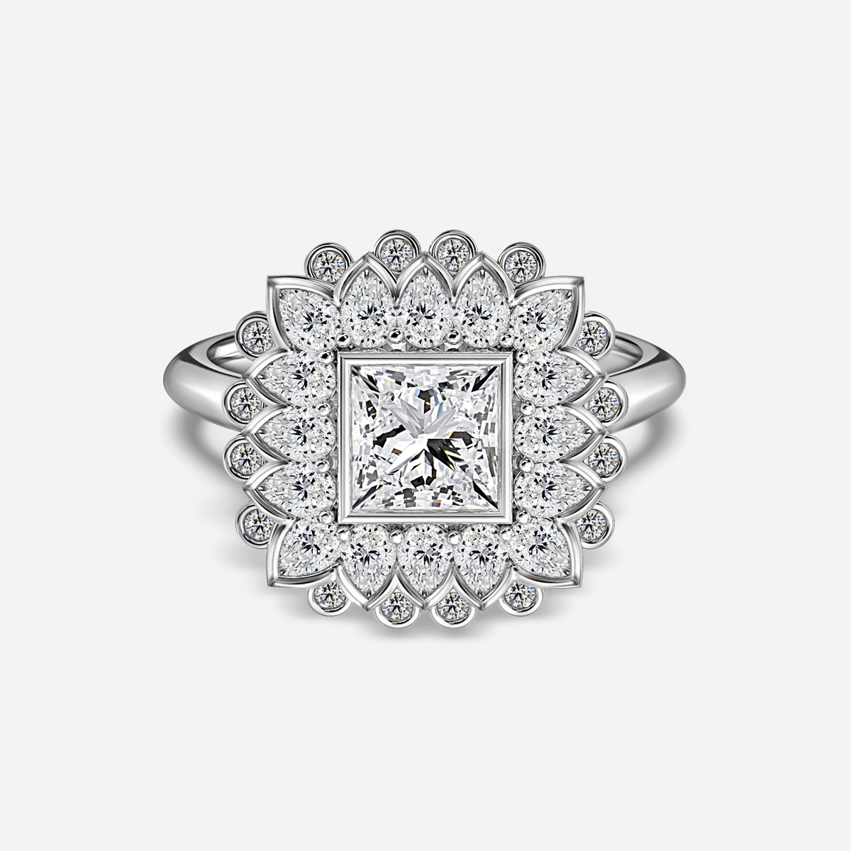 The Aelios Platinum Cluster Engagement Ring showcases a brilliant center diamond surrounded by a halo of pear-shaped diamonds, with additional small round diamonds placed beyond the pear shapes. This luxurious platinum setting creates a layered, radiant design, enhancing the ring’s elegance and extending its sparkling beauty. Handcrafted in Hatton Gardens, London. Centre Diamond Not Included Setting only