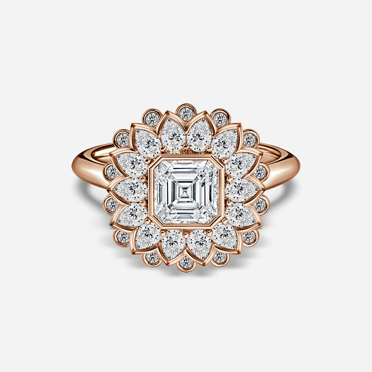 The Aelios Rose Gold Cluster Engagement Ring showcases a brilliant center diamond surrounded by a halo of pear-shaped diamonds, with additional small round diamonds placed beyond the pear shapes. This luxurious rose gold setting creates a layered, radiant design, enhancing the ring’s elegance and extending its sparkling beauty. Handcrafted in Hatton Gardens, London. Centre Diamond Not Included Setting only