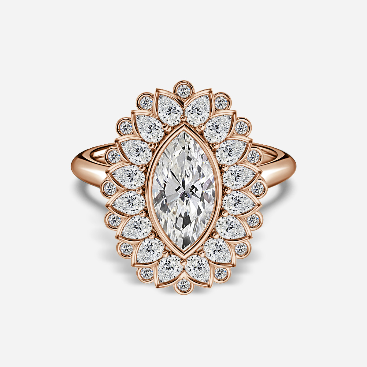 The Aelios Rose Gold Cluster Engagement Ring showcases a brilliant center diamond surrounded by a halo of pear-shaped diamonds, with additional small round diamonds placed beyond the pear shapes. This luxurious rose gold setting creates a layered, radiant design, enhancing the ring’s elegance and extending its sparkling beauty. Handcrafted in Hatton Gardens, London. Centre Diamond Not Included Setting only