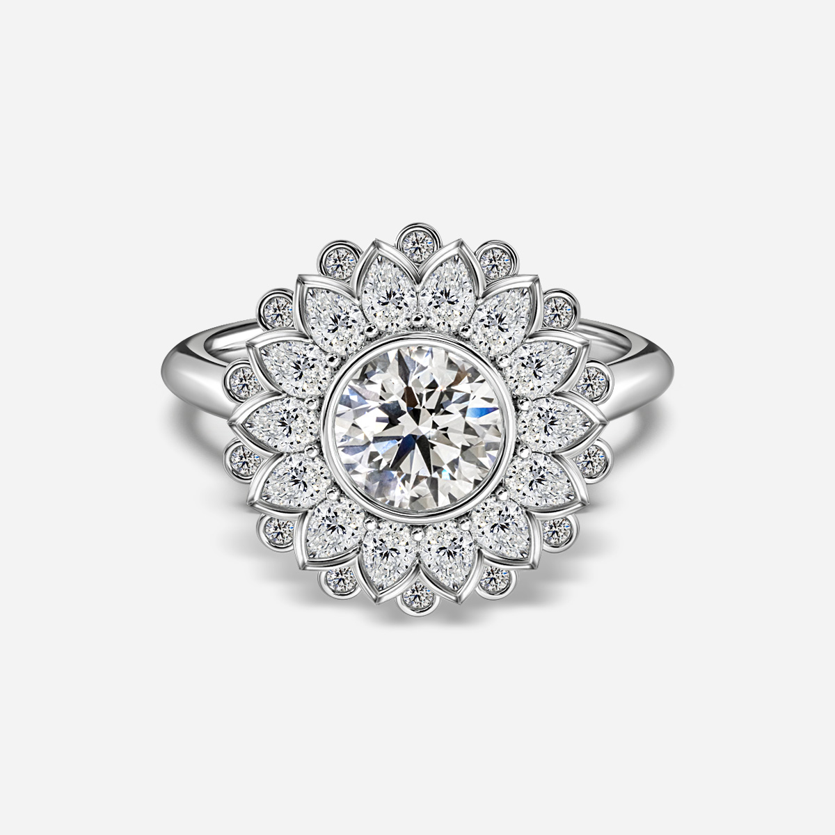 The Aelios White Gold Cluster Engagement Ring showcases a brilliant center diamond surrounded by a halo of pear-shaped diamonds, with additional small round diamonds placed beyond the pear shapes. This luxurious white gold setting creates a layered, radiant design, enhancing the ring’s elegance and extending its sparkling beauty. Handcrafted in Hatton Gardens, London. Centre Diamond Not Included Setting only