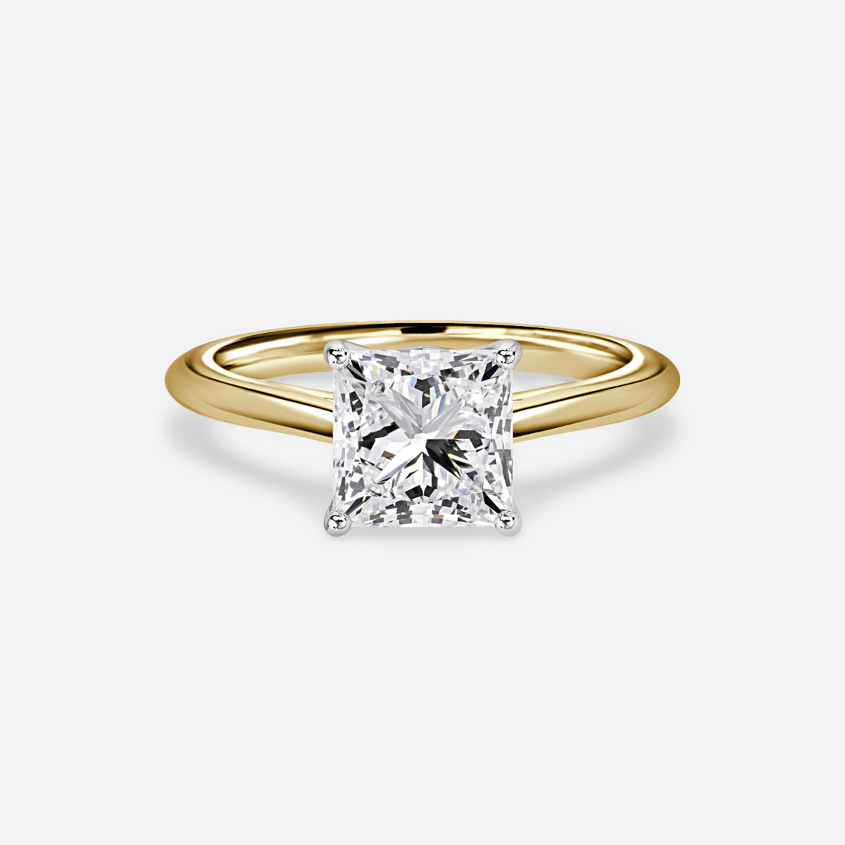 Masterfully designed, our yellow gold two-tone petal solitaire engagement ring boasts an intricate petal-inspired setting that beautifully showcases a brilliant solitaire, symbolizing the flourishing of your eternal love story. Handcrafted with care in the renowned Hatton Gardens, London. Centre Diamond Not Included Setting only.