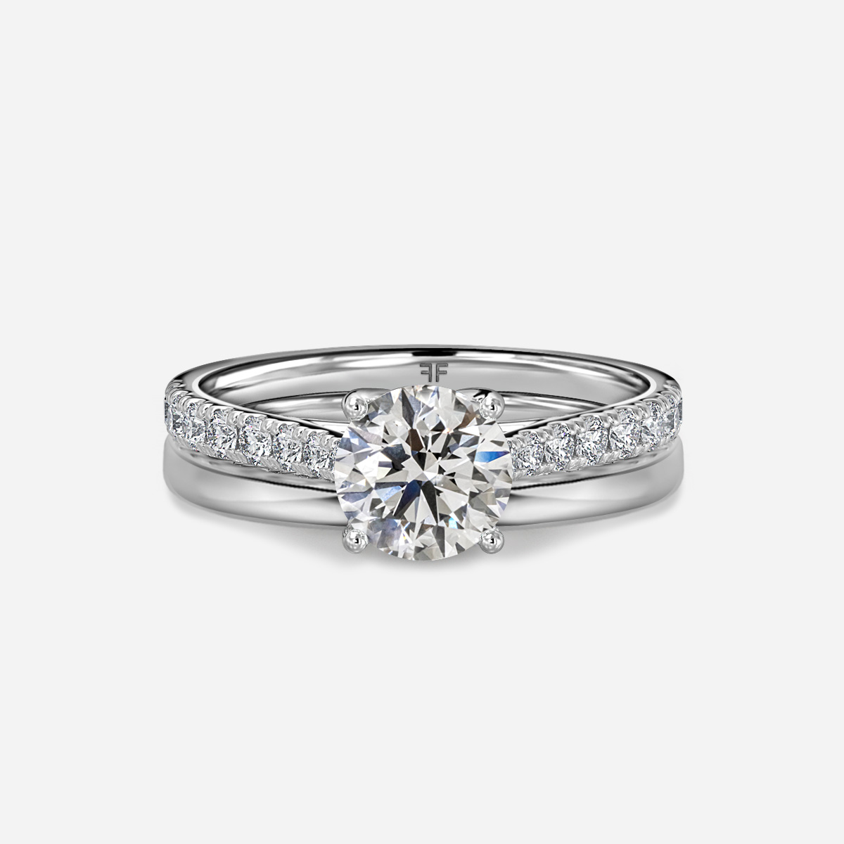 Experience the pinnacle of sophistication with the Aerin White Gold Plain Band Bridal Set Engagement Ring. This exquisite set showcases a captivating petal basket setting paired with a dazzling plain band wedding ring, embodying timeless elegance and symbolizing enduring commitment with refined style for your cherished union. Handcrafted in Hatton Gardens, London. Centre Diamond Not Included Setting only.