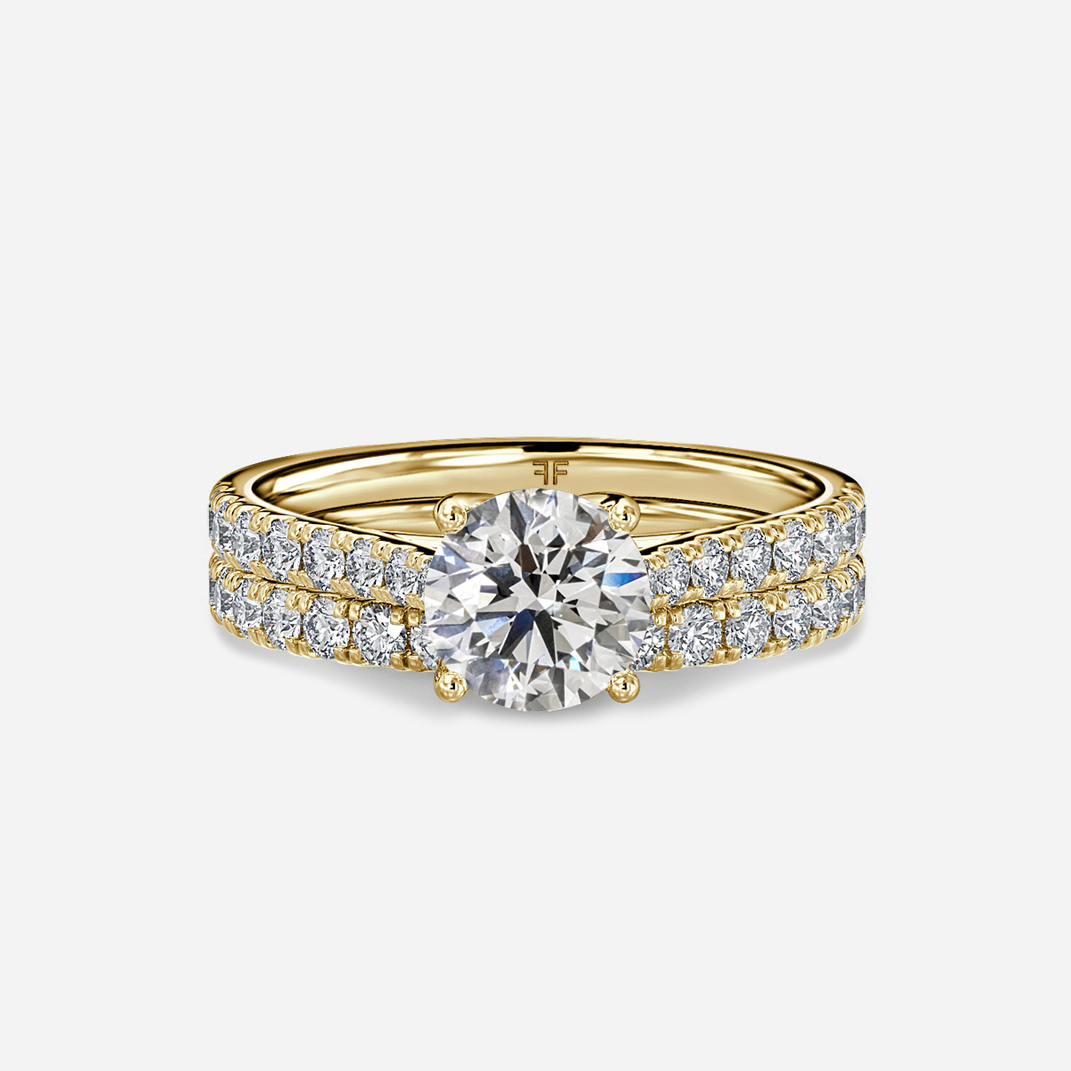 Experience the pinnacle of sophistication with the Aerin Yellow Gold Pavé Band Bridal Set Engagement Ring. This exquisite set showcases a captivating petal basket setting paired with a dazzling diamond band wedding ring, embodying timeless elegance and symbolizing enduring commitment with refined style for your cherished union. Handcrafted in Hatton Gardens, London. Centre Diamond Not Included Setting only.