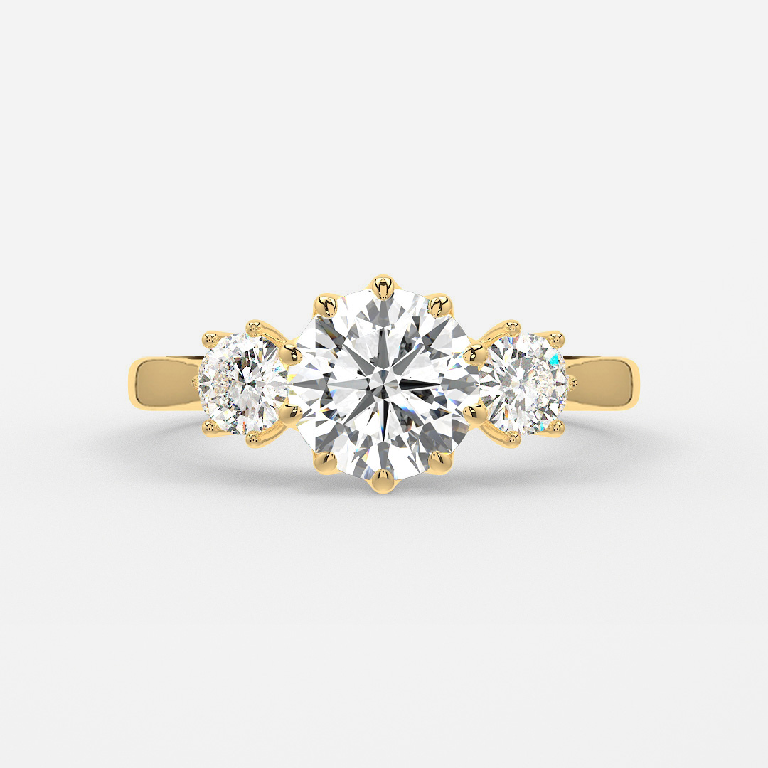 The Áine Yellow Gold Trilogy Engagement Ring features a round center diamond set in a 10-prong setting, with two round diamonds on each side. Made from yellow gold, this elegant design offers timeless beauty and sparkle. Handcrafted in Hatton Gardens, London. Centre Diamond Not Included Setting only
