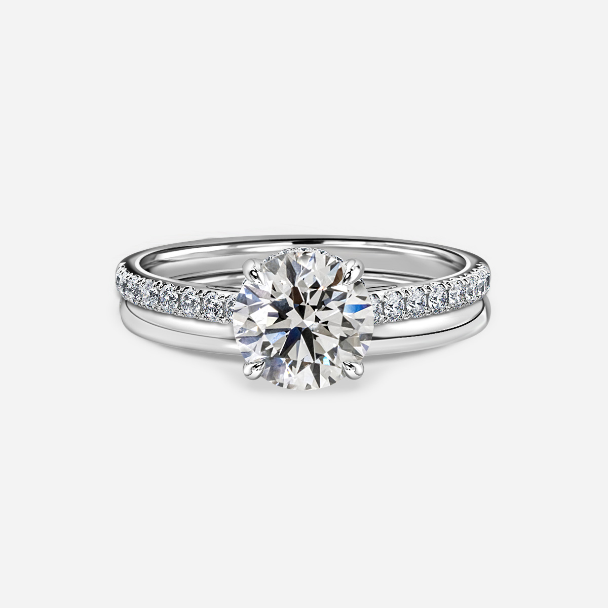 The Aisha Bridal Set is an exquisite expression of timeless elegance, featuring the enchanting Aisha hidden Halo Engagement Ring coupled with a classic plain Wedding Band, all crafted in white gold. This set creates a stunning union of sophistication and grace for the perfect celebration of love. Handcrafted in Hatton Gardens, London. Centre Diamond Not Included Setting Only