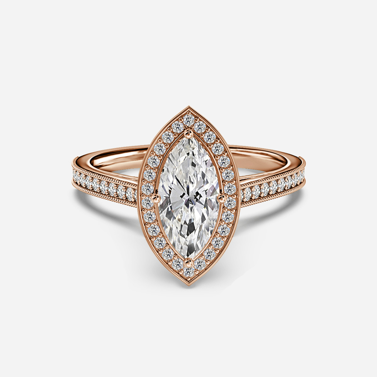 A rose gold milgrain-set halo engagement ring, adorned with pave-set diamonds, exudes elegance and luxury. Expertly handcrafted in Hatton Garden, London. Centre Diamond Not Included Setting Only