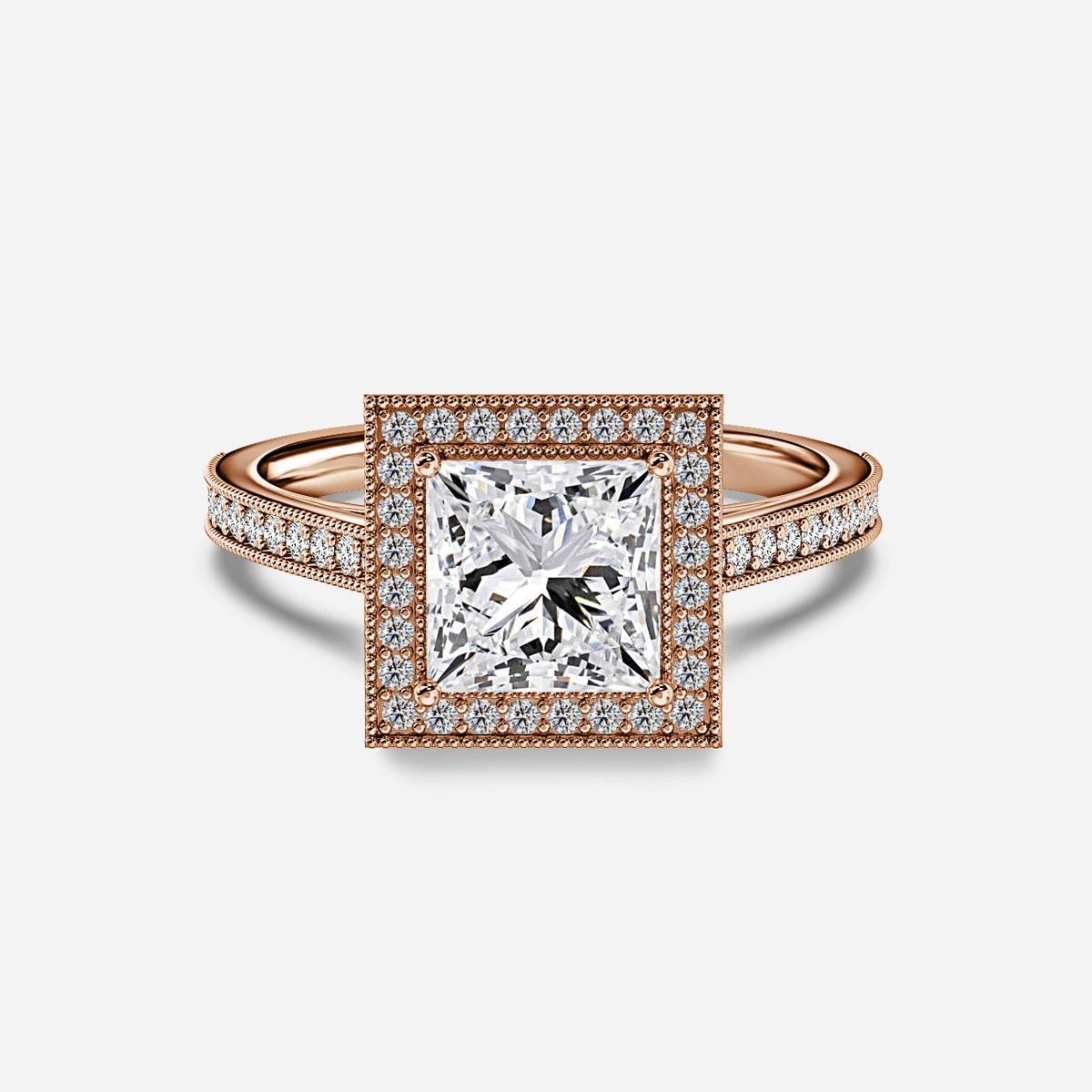 A rose gold milgrain-set halo engagement ring, adorned with pave-set diamonds, exudes elegance and luxury. Expertly handcrafted in Hatton Garden, London. Centre Diamond Not Included Setting Only