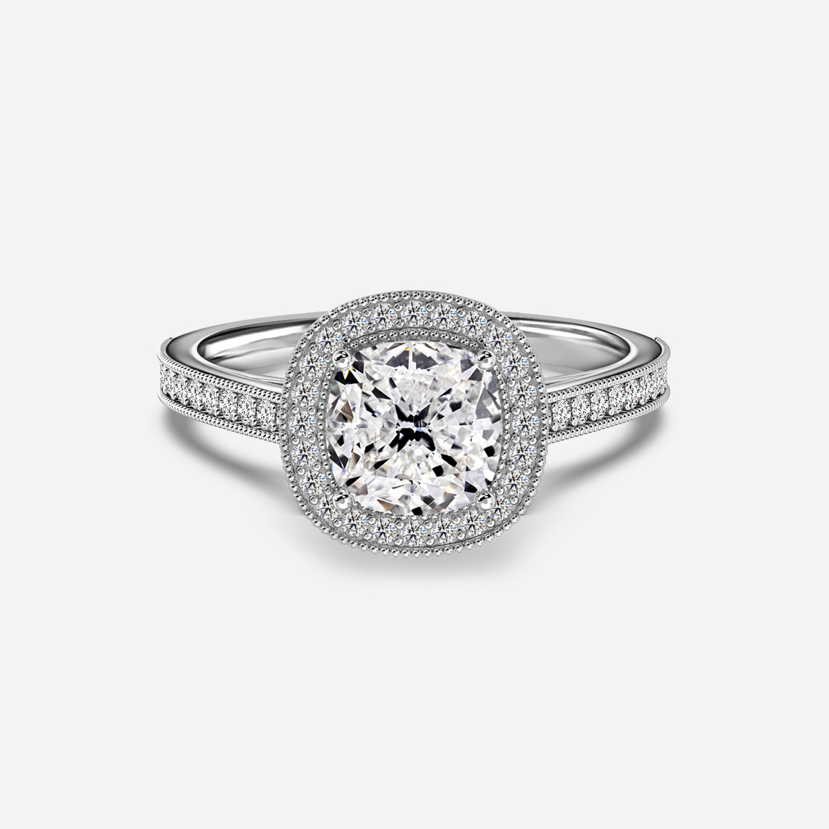 A white gold halo engagement ring with a milgrain design and pavé-set diamonds for an elegant, luxurious look. Handcrafted in Hatton Gardens, London. Centre Diamond Not Included Setting Only