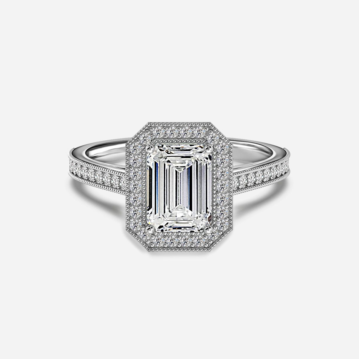 A white gold halo engagement ring with milgrain details and pavé-set diamonds for a luxurious, elegant look. Handcrafted in Hatton Gardens, London. Centre Diamond Not Included Setting Only