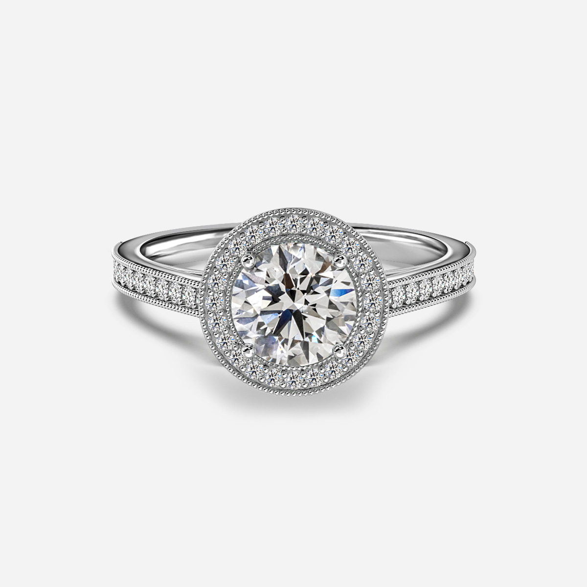 A white gold halo engagement ring with milgrain details and pavé-set diamonds for a luxurious, elegant look. Handcrafted in Hatton Gardens, London. Centre Diamond Not Included Setting Only