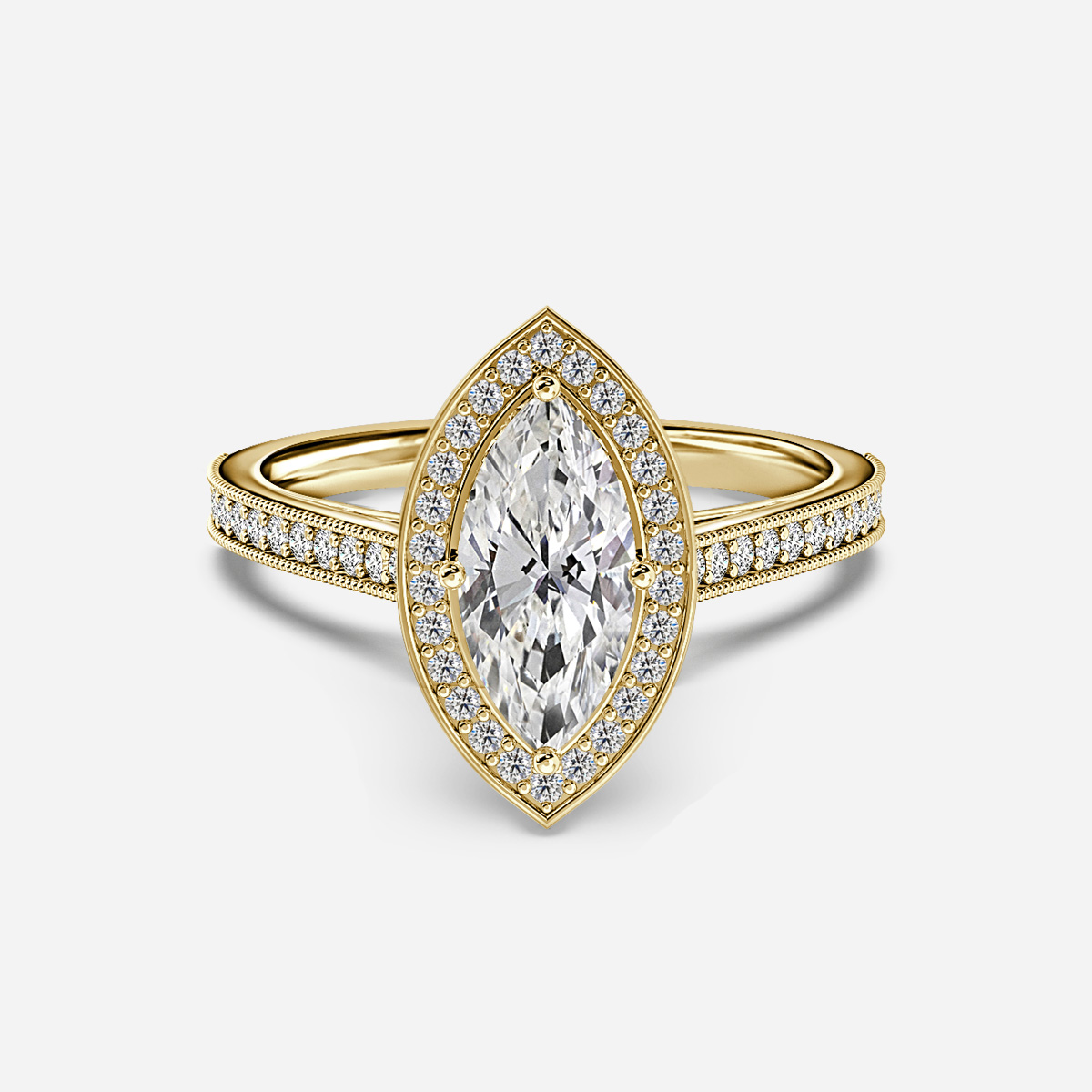A yellow gold halo engagement ring with milgrain detailing, fully adorned with pave-set diamonds for a timeless and elegant touch. Handcrafted in Hatton Gardens, London. Centre Diamond Not Included Setting Only