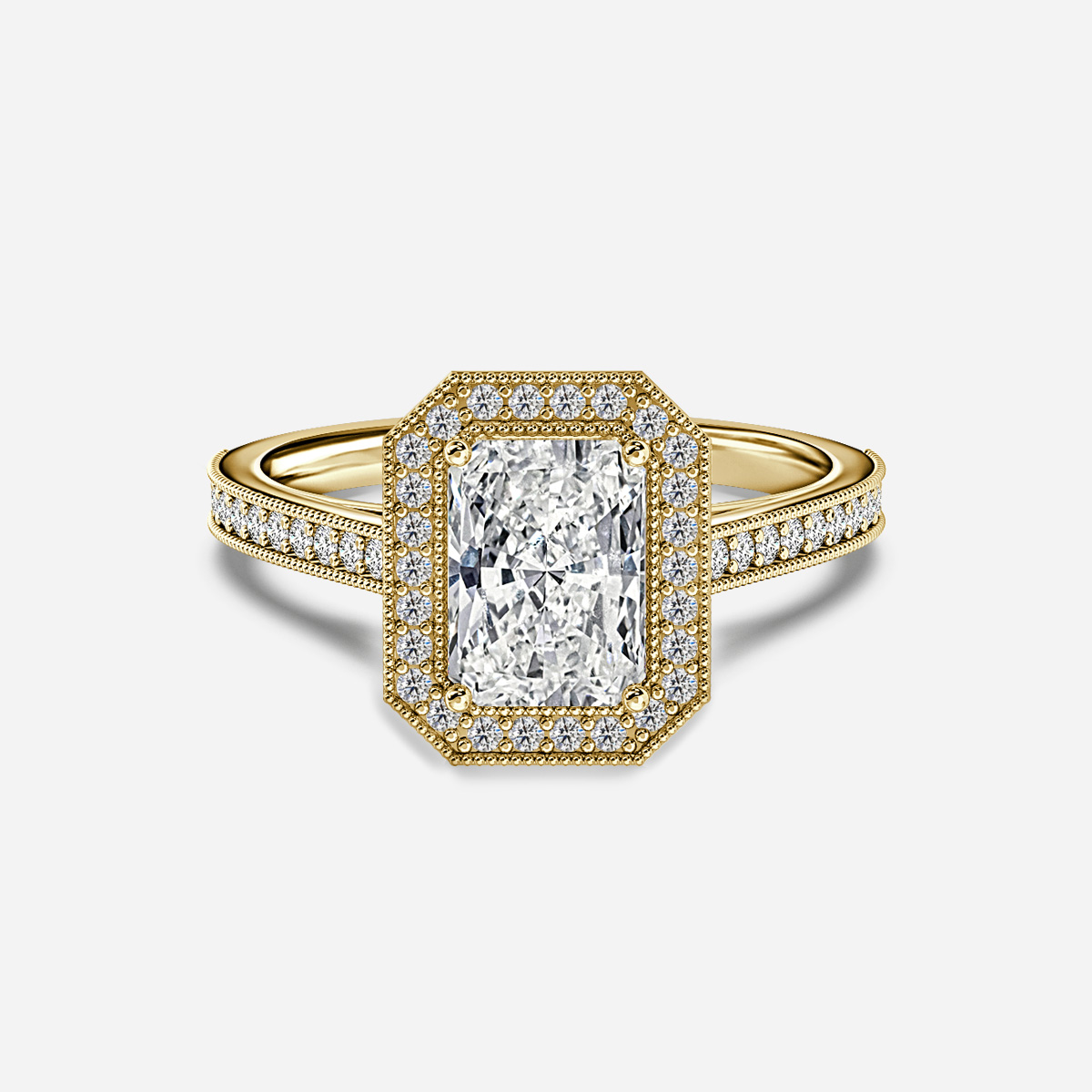 A yellow gold halo engagement ring with milgrain detailing, fully adorned with pave-set diamonds for a timeless and elegant touch. Handcrafted in Hatton Gardens, London. Centre Diamond Not Included Setting Only