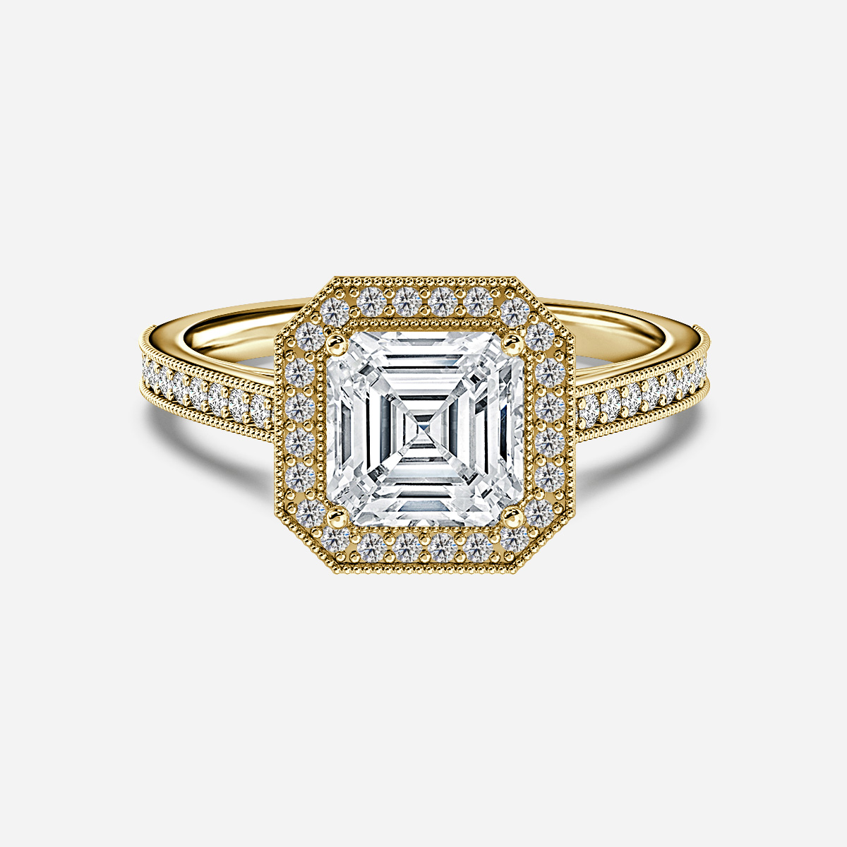 A yellow gold halo engagement ring with milgrain detail, fully encrusted with pave diamonds for timeless elegance. Handcrafted in Hatton Gardens, London. Centre Diamond Not Included Setting Only