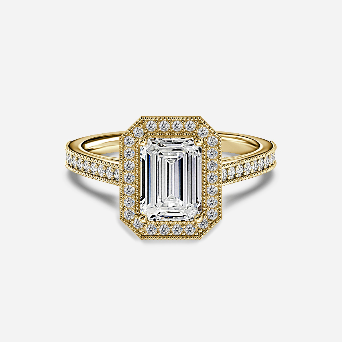 A yellow gold halo engagement ring with milgrain detail, fully encrusted with pave diamonds for timeless elegance. Handcrafted in Hatton Gardens, London. Centre Diamond Not Included Setting Only