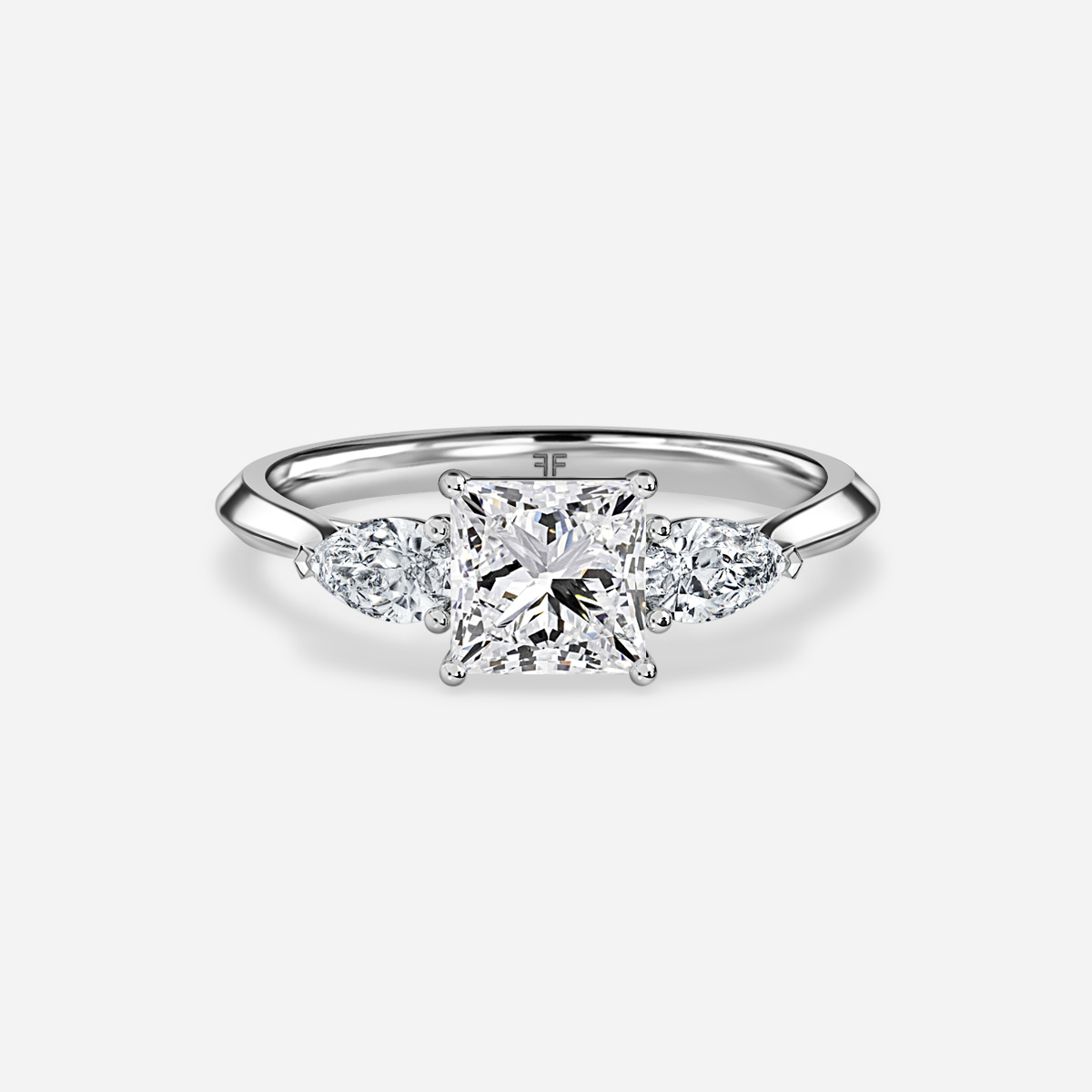 The Amaya Platinum Pear Shape Wedfit Trilogy Engagement Ring mesmerizes with two pear diamonds delicately cradling the center stone, creating a captivating trilogy setting. A symbol of enduring love, this ring exudes timeless elegance and distinctive charm. Handcrafted in Hatton Garden, London Centre Diamond Not Included Setting Only