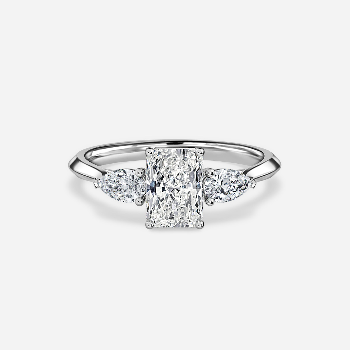 The Amaya Platinum Pear Shape Wedfit Trilogy Engagement Ring mesmerizes with two pear diamonds delicately cradling the center stone, creating a captivating trilogy setting. A symbol of enduring love, this ring exudes timeless elegance and distinctive charm. Handcrafted in Hatton Garden, London Centre Diamond Not Included Setting Only