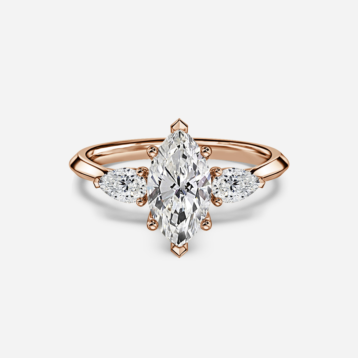 The Amaya Rose Gold Pear Shape Wedfit Trilogy Engagement Ring mesmerizes with two pear diamonds delicately cradling the center stone, creating a captivating trilogy setting. A symbol of enduring love, this ring exudes timeless elegance and distinctive charm. Handcrafted in Hatton Garden, London Centre Diamond Not Included Setting Only
