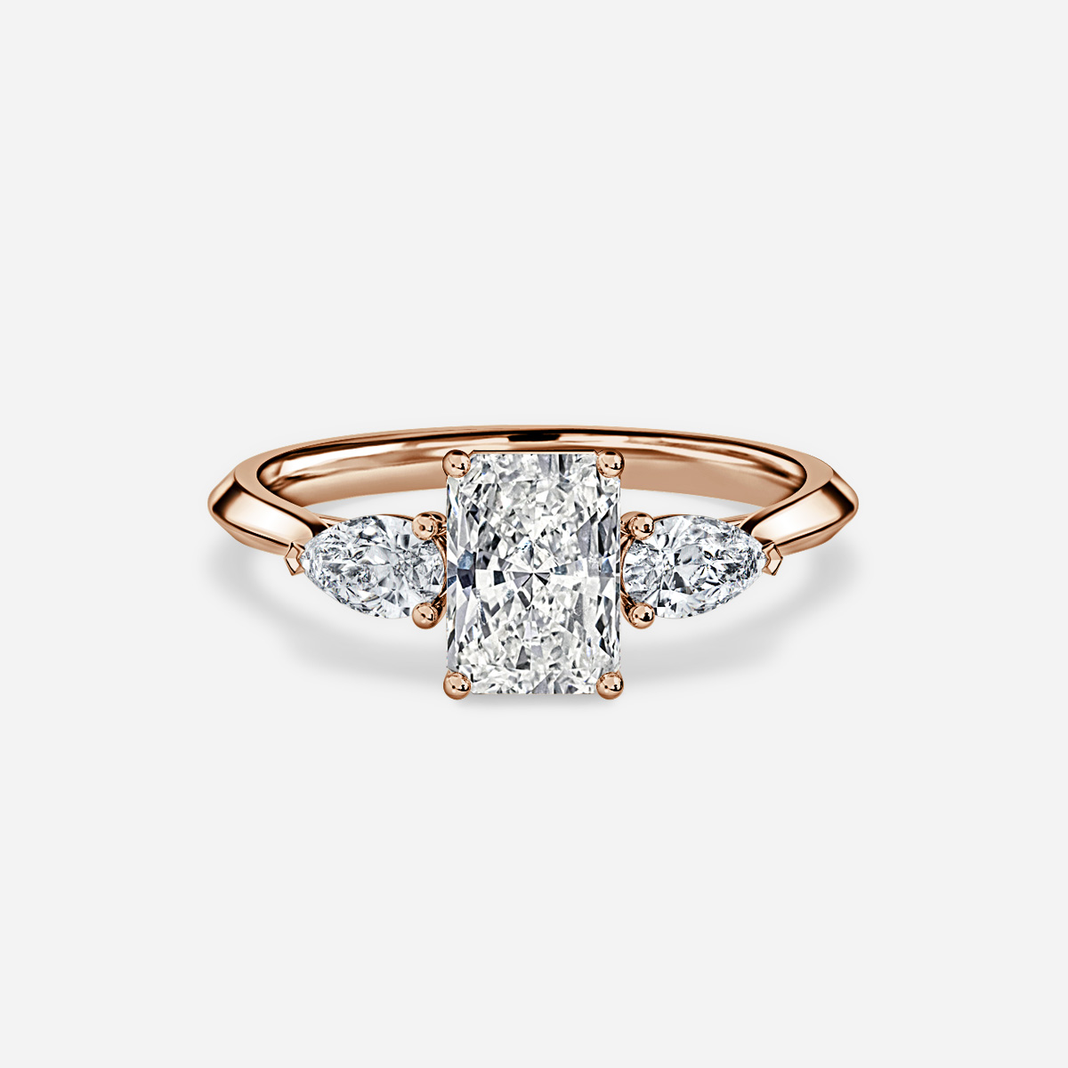 The Amaya Rose Gold Pear Shape Wedfit Trilogy Engagement Ring mesmerizes with two pear diamonds delicately cradling the center stone, creating a captivating trilogy setting. A symbol of enduring love, this ring exudes timeless elegance and distinctive charm. Handcrafted in Hatton Garden, London Centre Diamond Not Included Setting Only