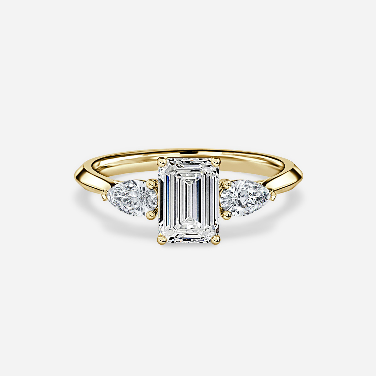 The Amaya Yellow Gold Pear Shape Wedfit Trilogy Engagement Ring mesmerizes with two pear diamonds delicately cradling the center stone, creating a captivating trilogy setting. A symbol of enduring love, this ring exudes timeless elegance and distinctive charm. Handcrafted in Hatton Garden, London Centre Diamond Not Included Setting Only