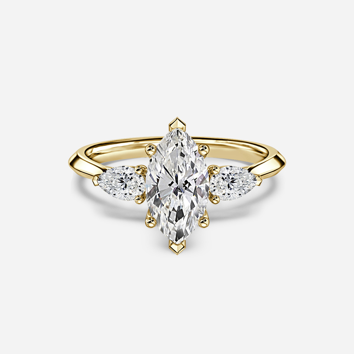 The Amaya Yellow Gold Pear Shape Wedfit Trilogy Engagement Ring mesmerizes with two pear diamonds delicately cradling the center stone, creating a captivating trilogy setting. A symbol of enduring love, this ring exudes timeless elegance and distinctive charm. Handcrafted in Hatton Garden, London Centre Diamond Not Included Setting Only