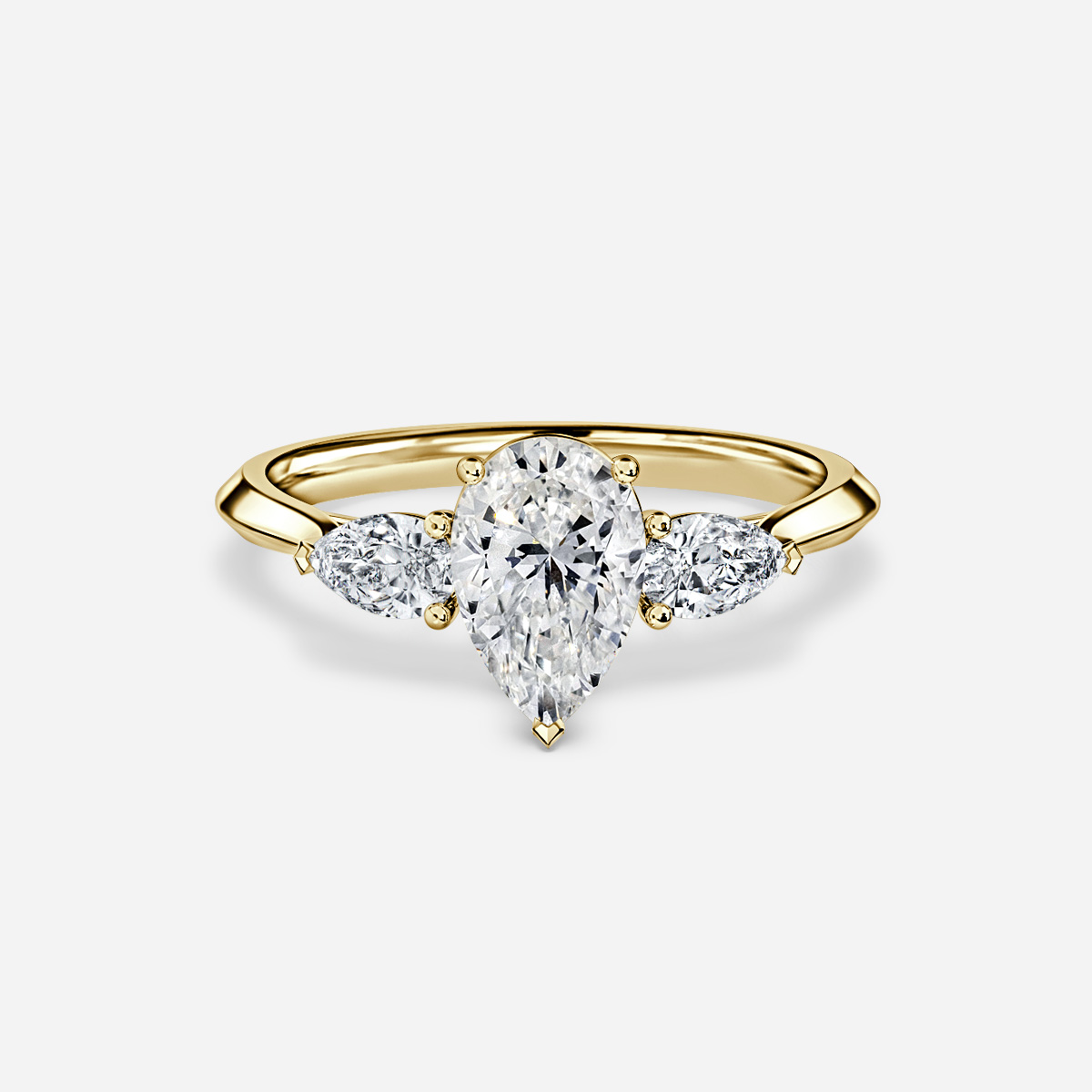 The Amaya Yellow Gold Pear Shape Wedfit Trilogy Engagement Ring mesmerizes with two pear diamonds delicately cradling the center stone, creating a captivating trilogy setting. A symbol of enduring love, this ring exudes timeless elegance and distinctive charm. Handcrafted in Hatton Garden, London Centre Diamond Not Included Setting Only