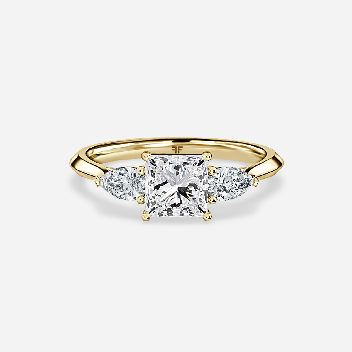 The Amaya Yellow Gold Pear Shape Wedfit Trilogy Engagement Ring mesmerizes with two pear diamonds delicately cradling the center stone, creating a captivating trilogy setting. A symbol of enduring love, this ring exudes timeless elegance and distinctive charm. Handcrafted in Hatton Garden, London Centre Diamond Not Included Setting Only
