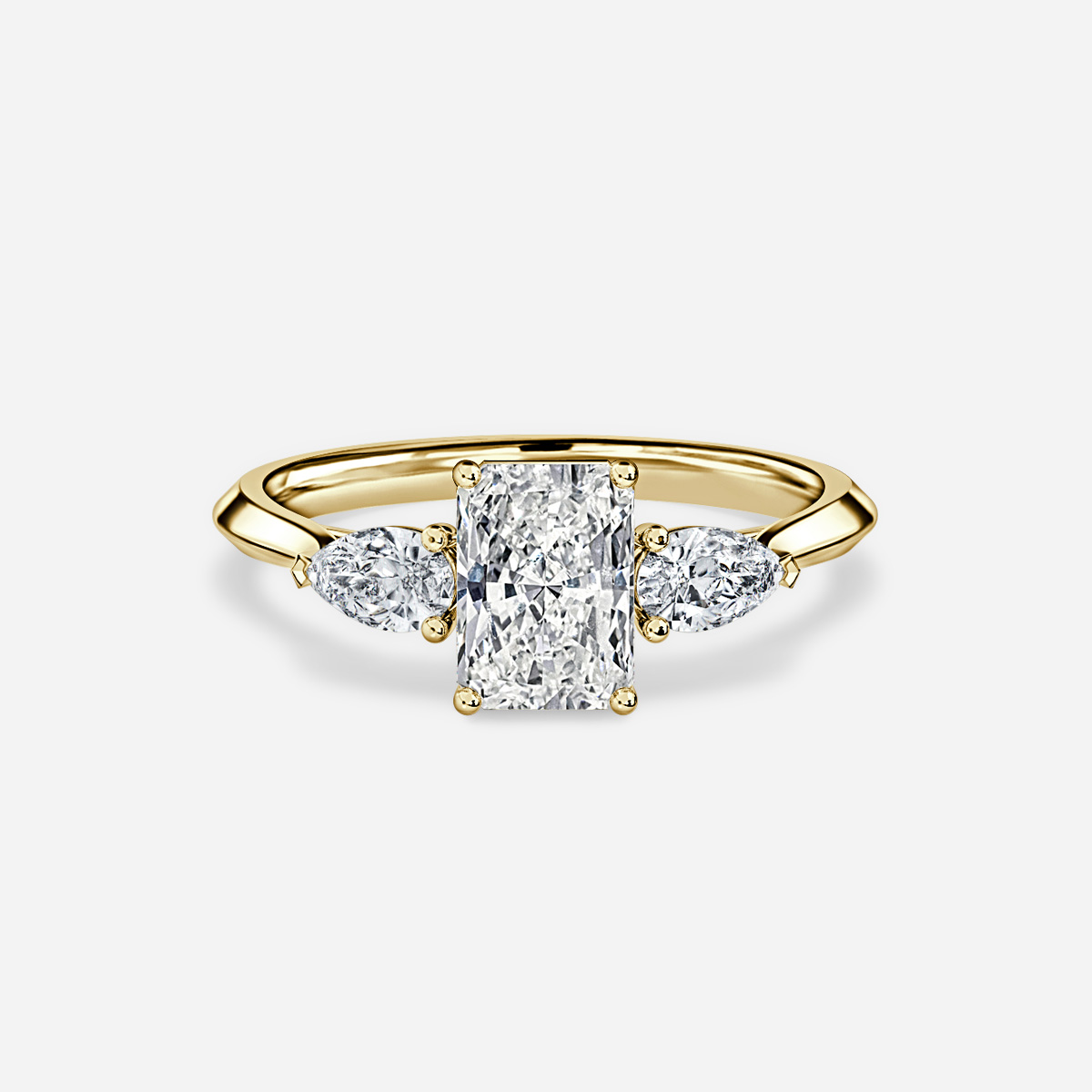 The Amaya Yellow Gold Pear Shape Wedfit Trilogy Engagement Ring mesmerizes with two pear diamonds delicately cradling the center stone, creating a captivating trilogy setting. A symbol of enduring love, this ring exudes timeless elegance and distinctive charm. Handcrafted in Hatton Garden, London Centre Diamond Not Included Setting Only