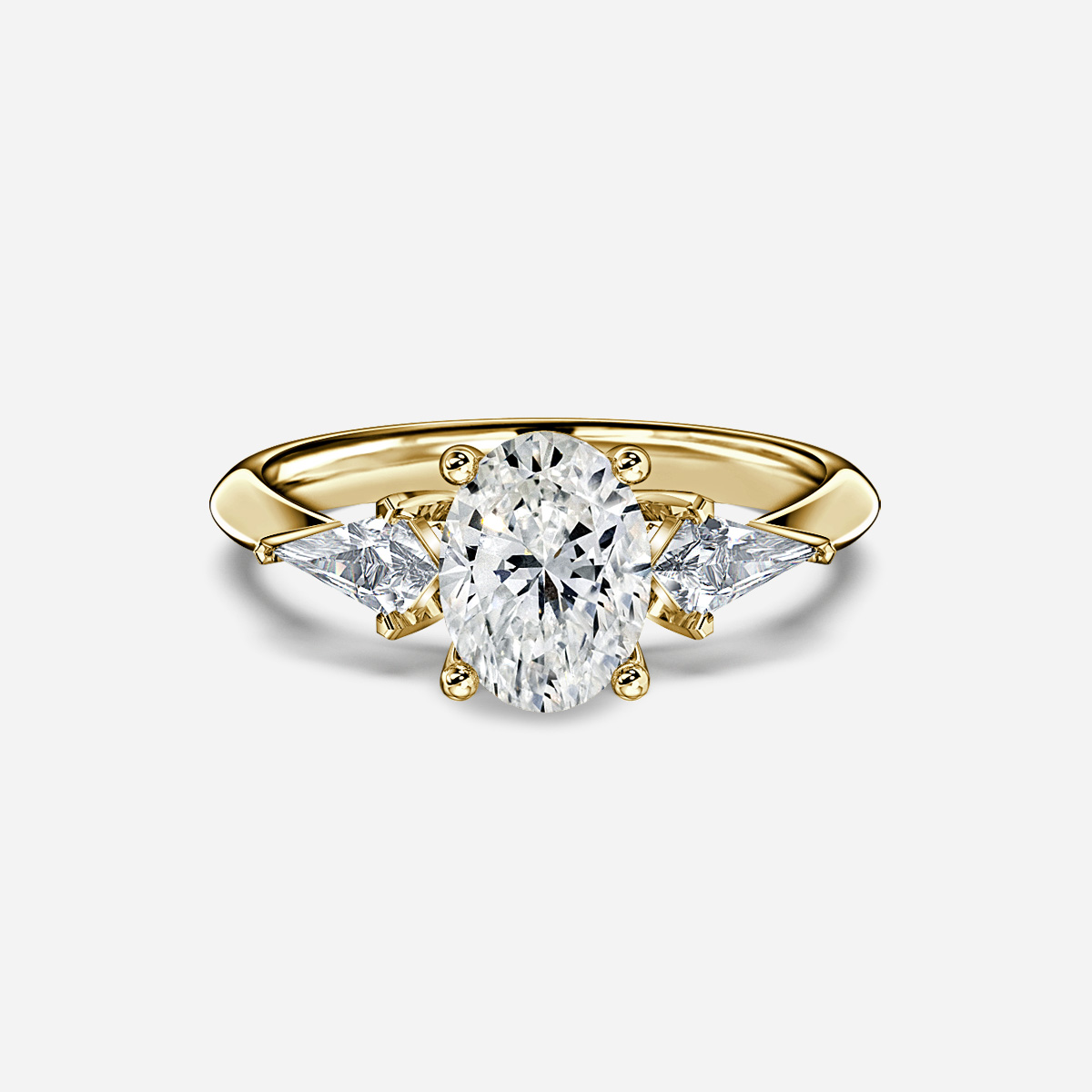 The Anam Cara Yellow Gold Trilogy Engagement Ring features a stunning oval diamond at its center, flanked by unique kite-shaped diamonds on either side. This elegant design symbolizes the journey of love, making it a perfect choice for a timeless proposal. Handcrafted in Hatton Gardens, London. Centre Diamond Not Included Setting Only