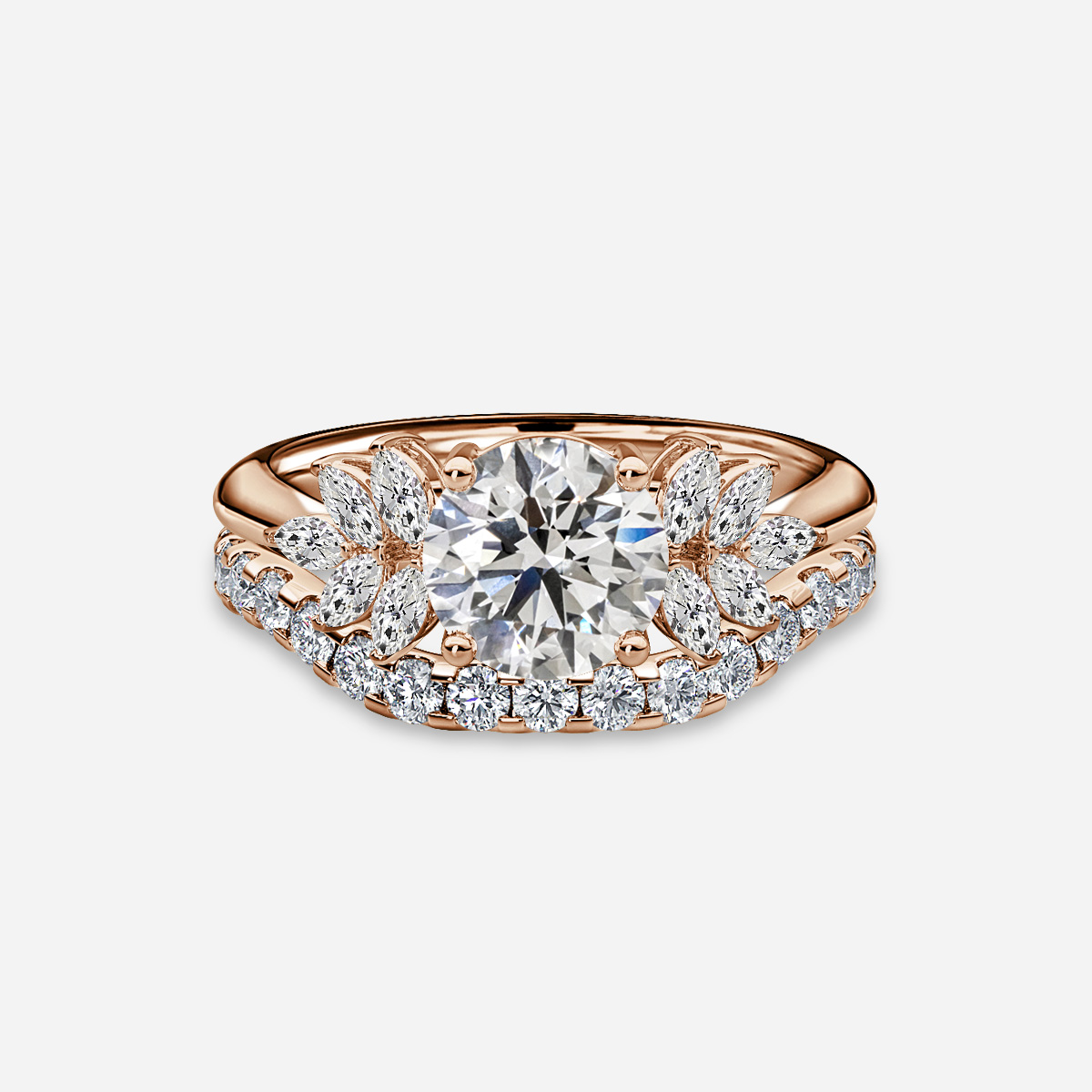 The Anastasia Rose Gold Pavé Band Bridal Set showcases a stunning Trilogy Anastasia engagement ring, paired seamlessly with a U-shaped to fit pave wedding band. This timeless set marries classic design with modern sophistication, offering a radiant symbol of enduring love. Handcrafted in Hatton Gardens, London. Centre Diamond Not Included Setting only.