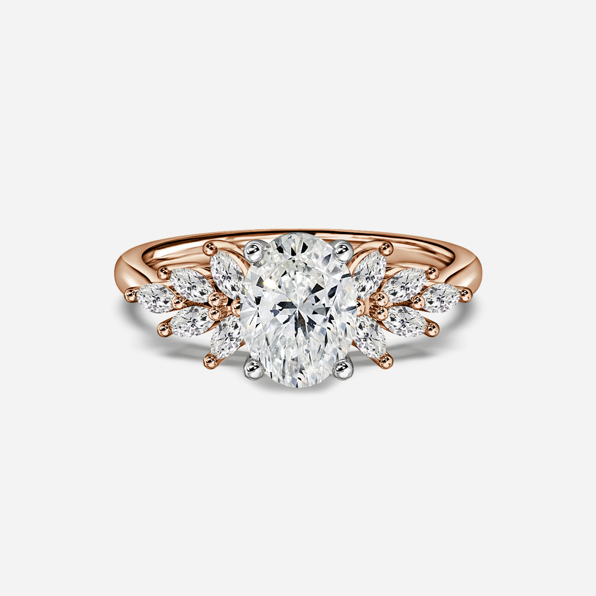 The Anastasia rose gold two-tone ring, with eleven stones in a trilogy design, symbolizes your shared journey. Flanking the center stone are five marquise-cut diamonds on each side, elegantly shaped like leaves. Handcrafted in Hatton Gardens, London. Centre Diamond Not Included Setting only