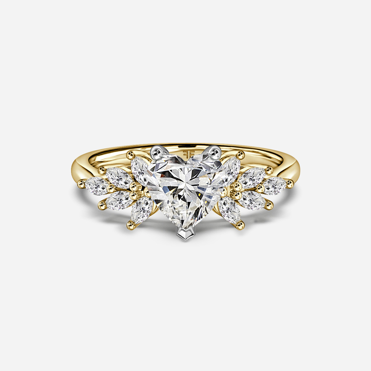 The Anastasia yellow gold two-tone ring, with eleven stones in a trilogy style, features marquise diamonds forming delicate leaf patterns. It beautifully symbolizes your shared journey and love. Handcrafted in Hatton Gardens, London. Centre Diamond Not Included Setting only