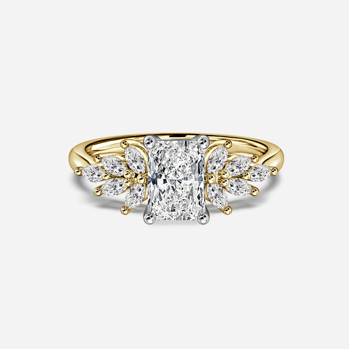 The Anastasia yellow gold two-tone ring, with eleven stones in a trilogy style, features marquise diamonds forming delicate leaf patterns. It beautifully symbolizes your shared journey and love. Handcrafted in Hatton Gardens, London. Centre Diamond Not Included Setting only