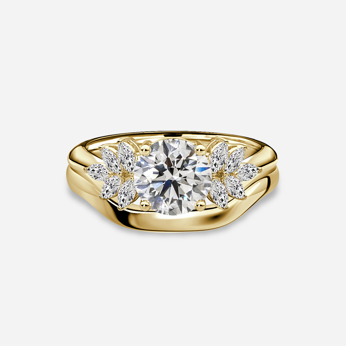 The Anastasia Yellow Gold Plain Band Bridal Set showcases a stunning Trilogy Anastasia engagement ring, paired seamlessly with a U-shaped to fit plain wedding band. This timeless set marries classic design with modern sophistication, offering a radiant symbol of enduring love. Handcrafted in Hatton Gardens, London. Centre Diamond Not Included Setting only.