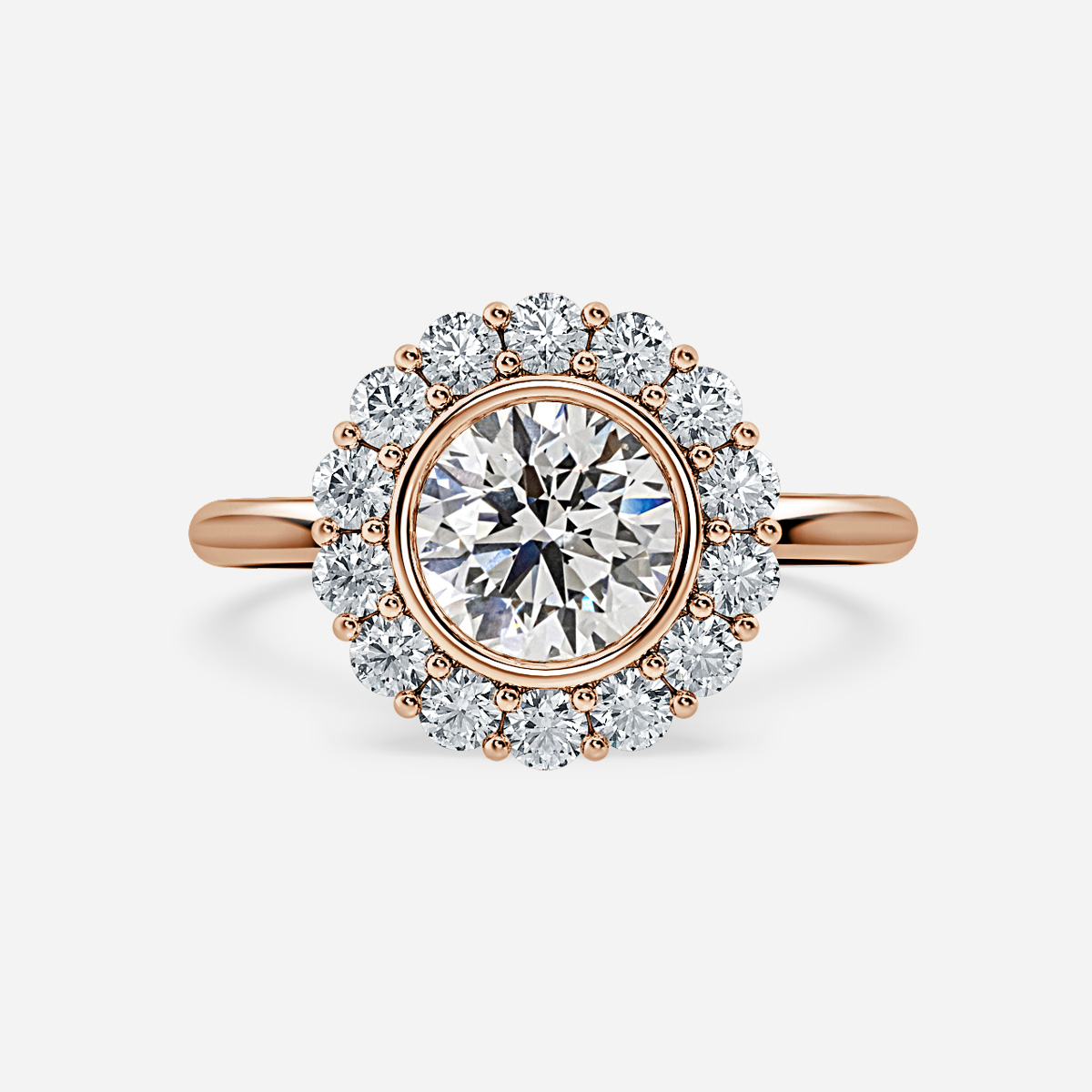 A stunning rose gold halo engagement ring with a floral design, offering a timeless and elegant look. Handcrafted in Hatton Garden, London Centre Diamond Not Included Setting Only