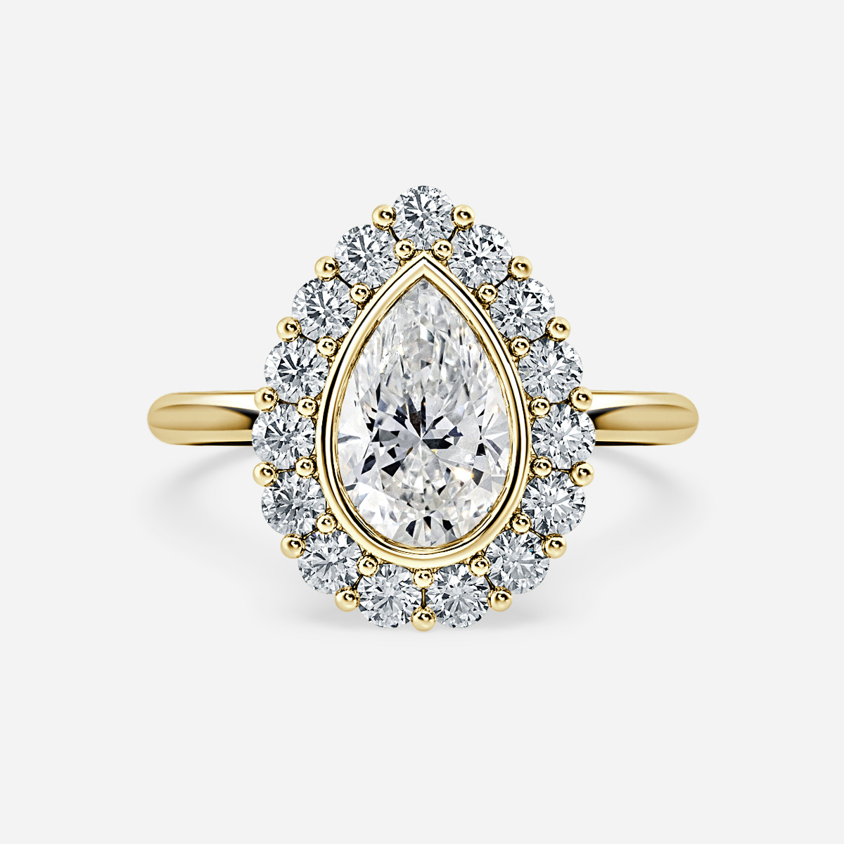 A stunning yellow gold halo engagement ring with a floral design, offering a timeless and elegant look. Handcrafted in Hatton Garden, London Centre Diamond Not Included Setting Only