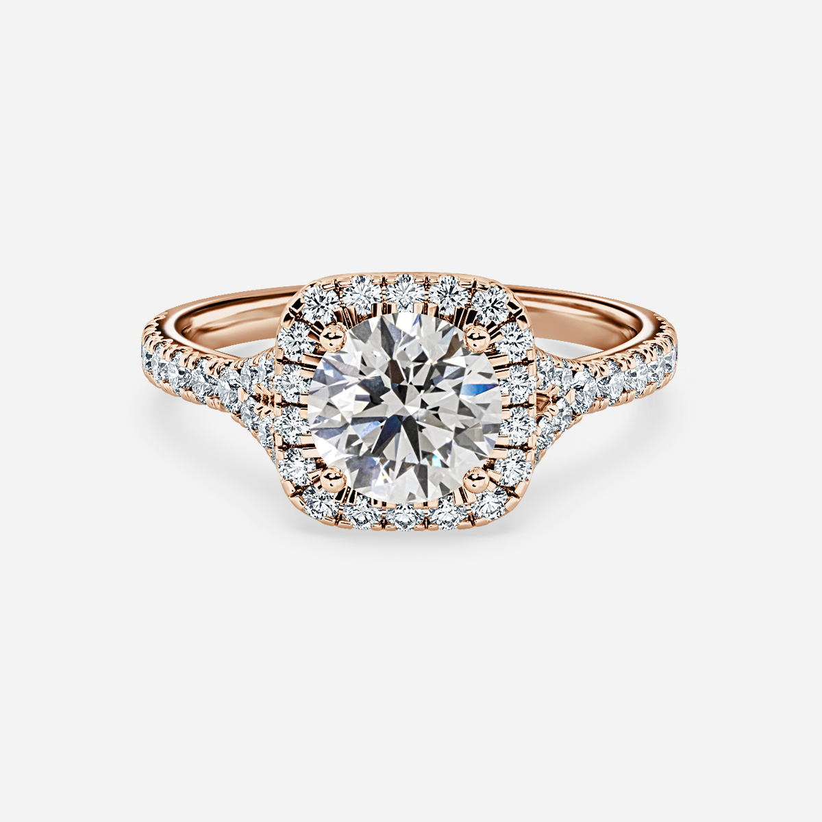 This rose gold engagement ring features a timeless split shank design embellished with pave diamonds and a central halo of diamonds, creating a look of pure sparkle and glamour. Handcrafted in Hatton Gardens, London. Centre Diamond Not Included Setting Only
