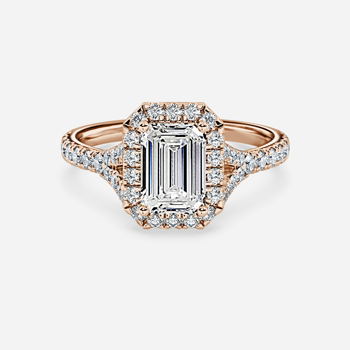 This rose gold engagement ring features a timeless split shank design embellished with pave diamonds and a central halo of diamonds, creating a look of pure sparkle and glamour. Handcrafted in Hatton Gardens, London. Centre Diamond Not Included Setting Only
