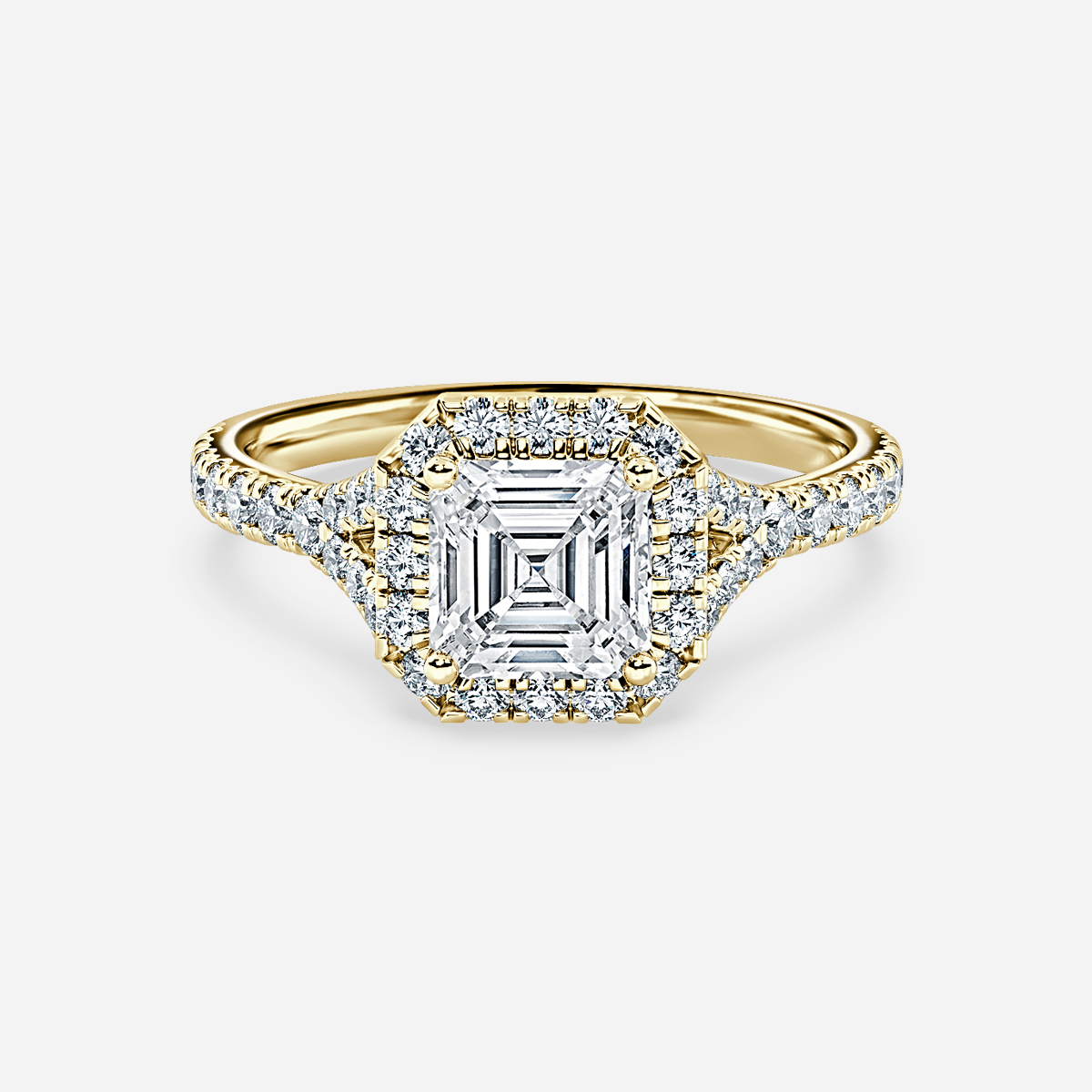 This yellow gold engagement ring features a timeless split shank design embellished with pave diamonds and a central halo of diamonds, creating a look of pure sparkle and glamour. Handcrafted in Hatton Gardens, London. Centre Diamond Not Included Setting Only