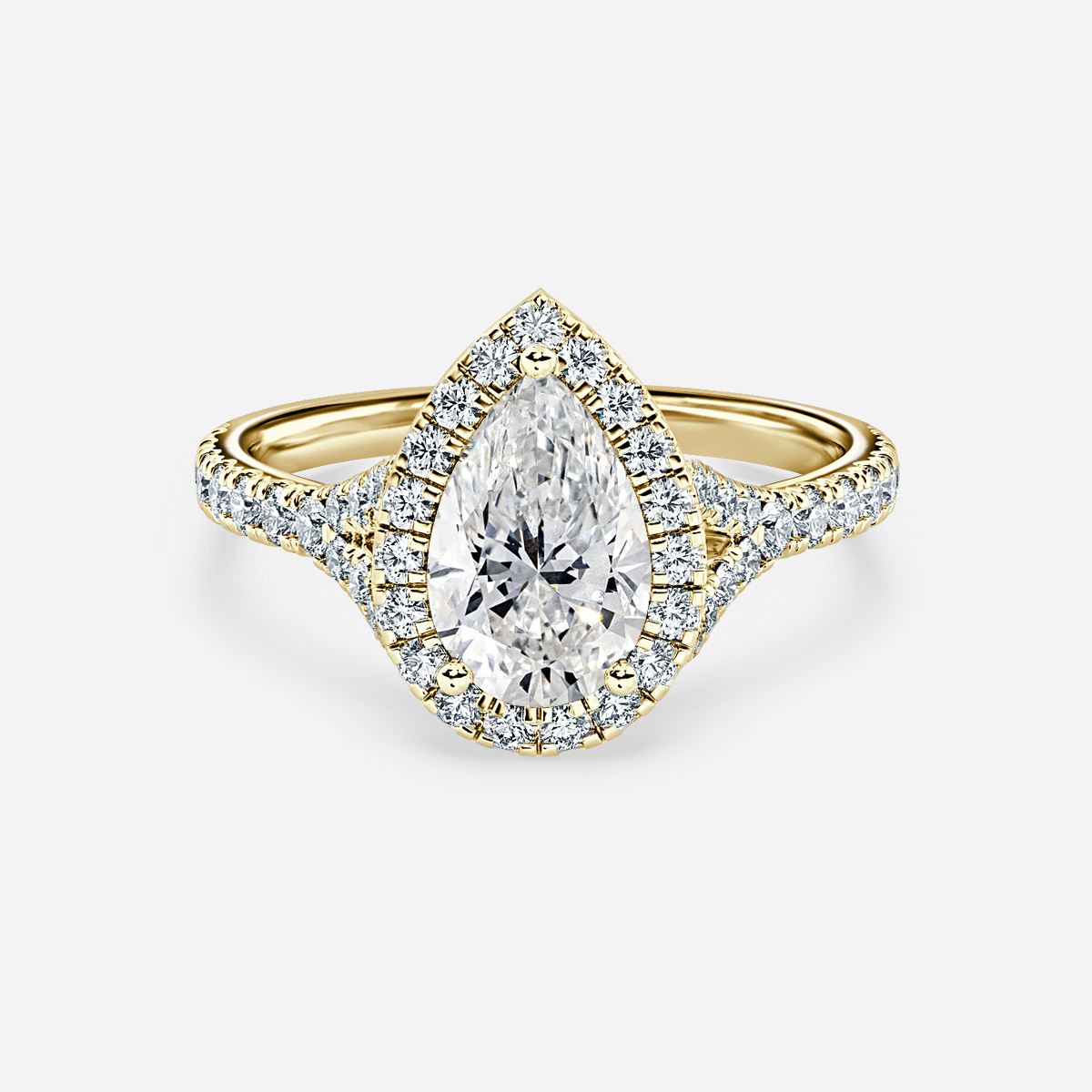 This yellow gold engagement ring features a timeless split shank design embellished with pave diamonds and a central halo of diamonds, creating a look of pure sparkle and glamour. Handcrafted in Hatton Gardens, London. Centre Diamond Not Included Setting Only